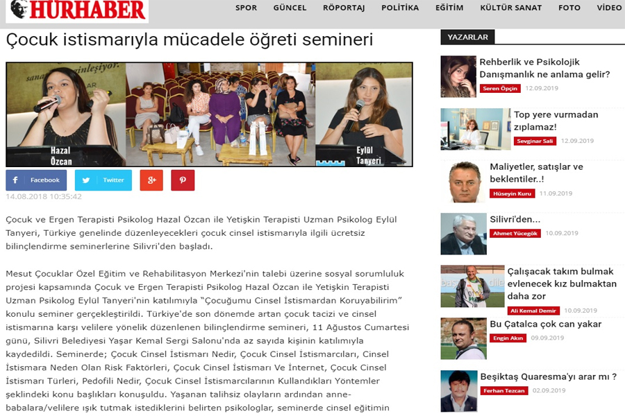 Çocuğumu Cinsel İstismardan Koruyabilirim Sosyal Sorumluluk Projemiz ile ilgili Haber Türk Yazısı